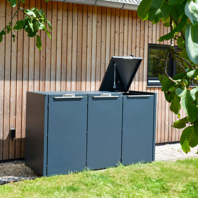 Die Verkleidung ist für 2, 3 oder 4 Container erhältlich und lässt sich vollständig in Farbe und Oberfläche individualisieren. Durch den multifunktionalen Deckel, die sanft schließende Magnettür und optionalen Lüftungsöffnungen wird nicht nur die Optik, sondern auch die Handhabung im Außenbereich deutlich verbessert.